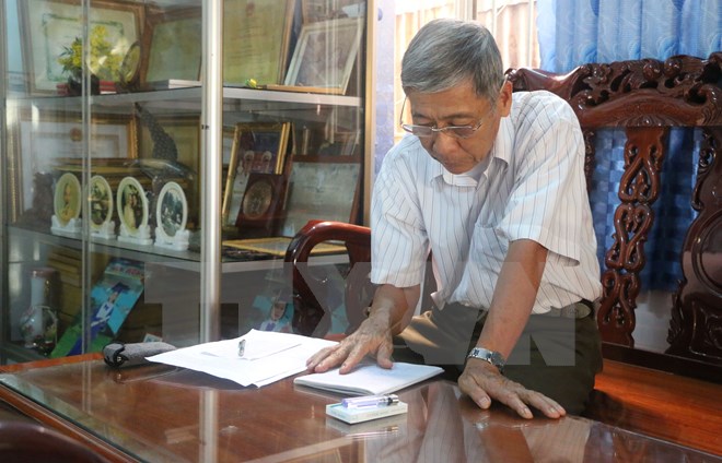 | Ông Huỳnh Trí với những kỷ vật theo ông trong suốt cuộc đời binh nghiệp. (Ảnh: Công Mạo/TTXVN) |
