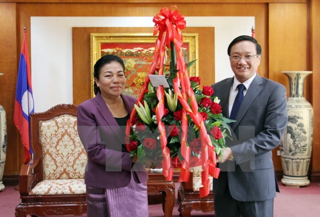 | Đoàn Đại biểu Ban Đối ngoại Trung ương Đảng NDCM Lào tới ĐSQ Việt Nam tại Lào chúc mừng Quốc khánh. (Ảnh: Phạm Kiên/TTXVN) |