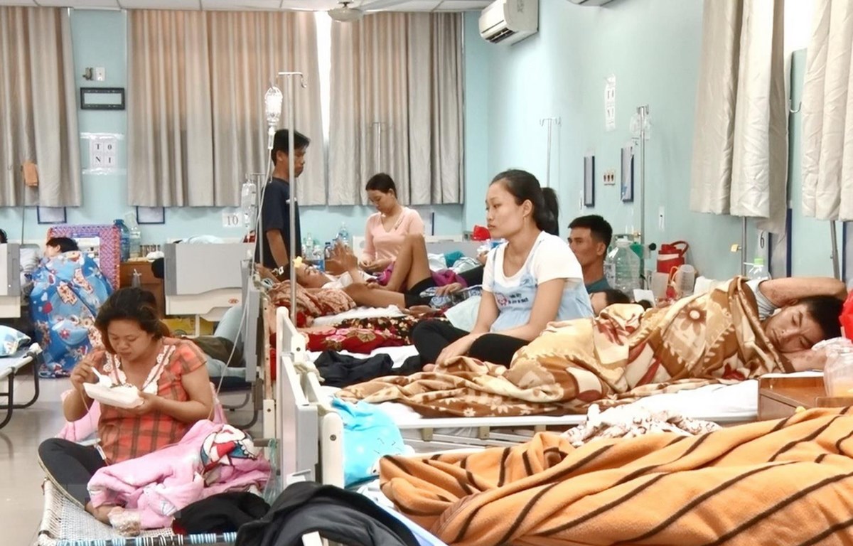| Bệnh viện quá tải nên các bệnh nhân được bố trí thêm giường trong phòng. (Ảnh: Lê Xuân/TTXVN) |