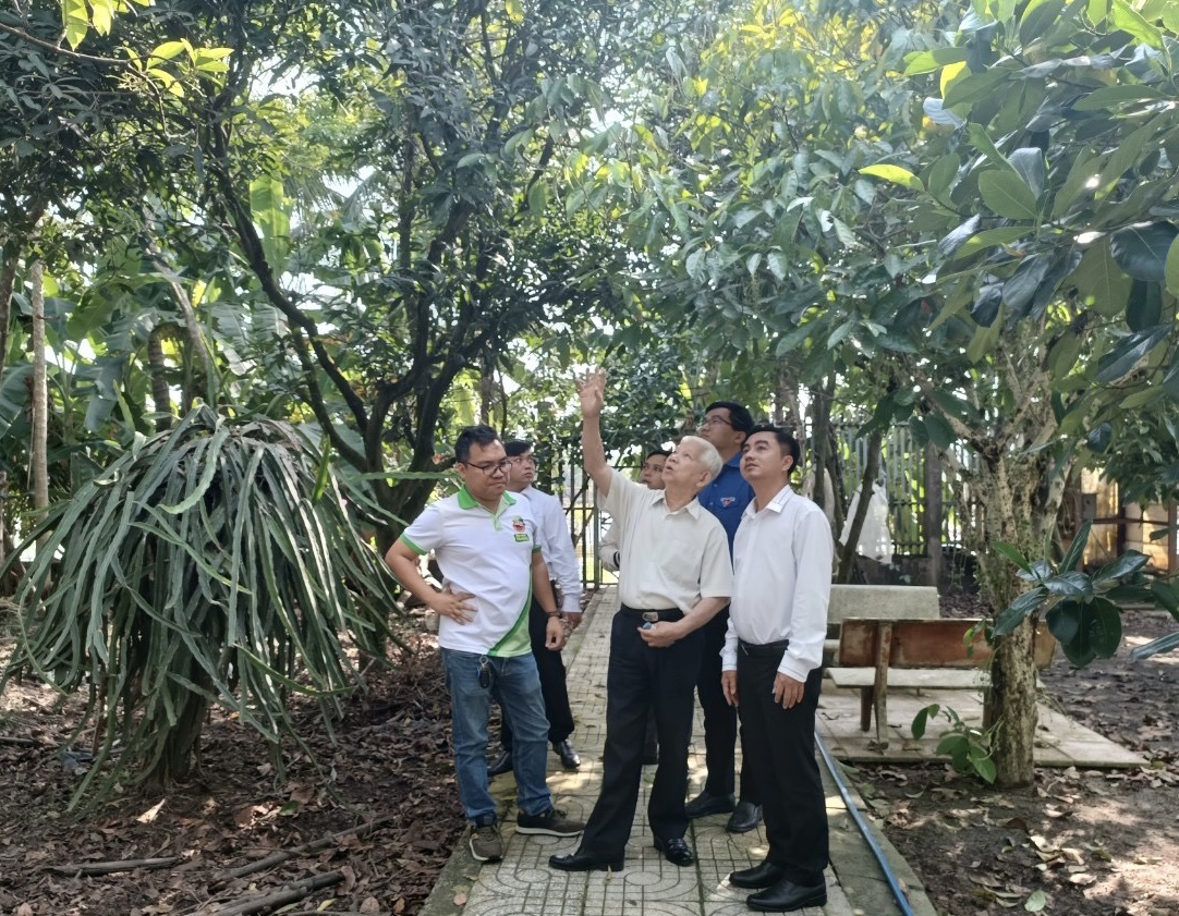 Nguyên Chủ tịch nước Nguyễn Minh Triết dẫn các nhà nông trẻ xuất sắc tham quan vườn cây xanh rợp bóng mát của gia đình ông và hòa vào thiên nhiên bình yên.