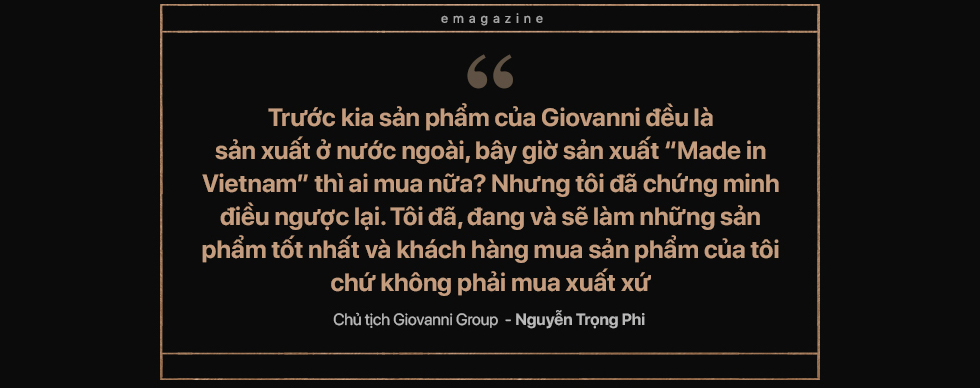 - Việc xây dựng nhà máy cũng là cuộc đấu tranh quyết liệt của tôi với “phần còn lại”. Không ai muốn xây dựng nhà máy cả bởi mọi người lo lắng. Trước kia sản phẩm của Giovanni đều là sản xuất ở nước ngoài, bây giờ sản xuất “Made in Vietnam” thì ai mua nữa? Nhưng tôi đã chứng minh điều ngược lại. Tôi đã, đang và sẽ làm những sản phẩm tốt nhất và khách hàng mua sản phẩm của tôi chứ không phải mua xuất xứ. Mọi người đều nghĩ nếu tôi làm vậy thì sẽ “phá” thương hiệu. Nhưng họ không hiểu được rằng bao nhiêu năm tôi lăn lộn ở nước ngoài, việc đặt hàng ở nước ngoài tiềm ẩn rất nhiều rủi ro bởi vì mình không kiểm soát được 100% chất lượng.