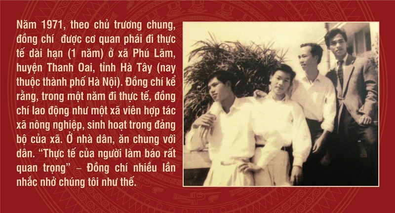 Trong những lần đi công tác ở nước ngoài, trước những vấn đề nhạy cảm, chúng tôi viết bài, làm tin thường xin ý kiến trực tiếp của đồng chí và tôi thường được anh em trong nhóm giao làm việc này. Với những lần làm việc như vậy dù trong giờ hành chính hay đến đêm khuya, tôi đều được đồng chí đọc, sửa từng chi tiết, câu chữ…