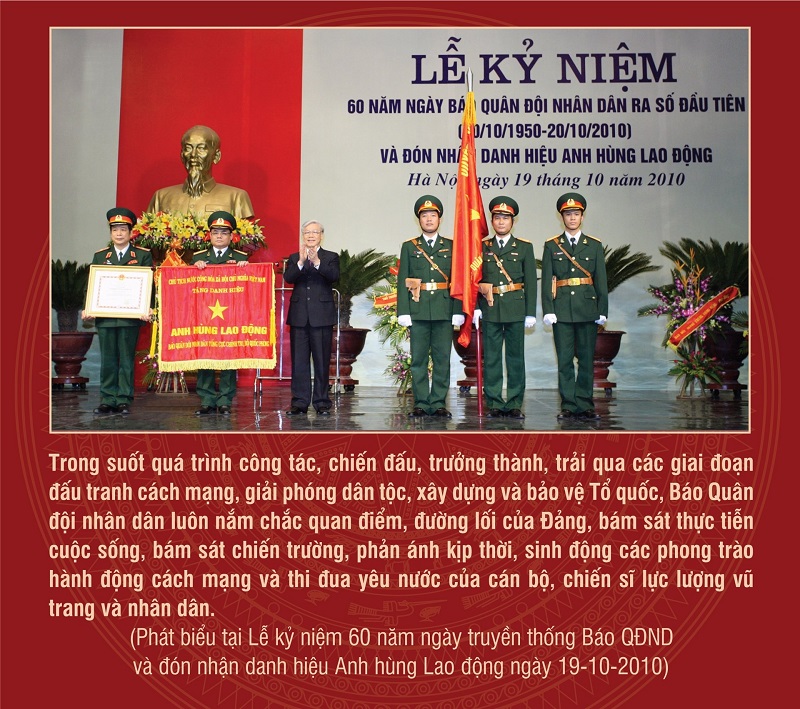 Sáng 19-10-2010, bỏ qua nghi lễ đón tiếp, đồng chí Nguyễn Phú Trọng đến thẳng Cung Văn hóa hữu nghị Việt Xô, trao danh hiệu Anh hùng Lao động và phát biểu chúc mừng Báo Quân đội nhân dân.
