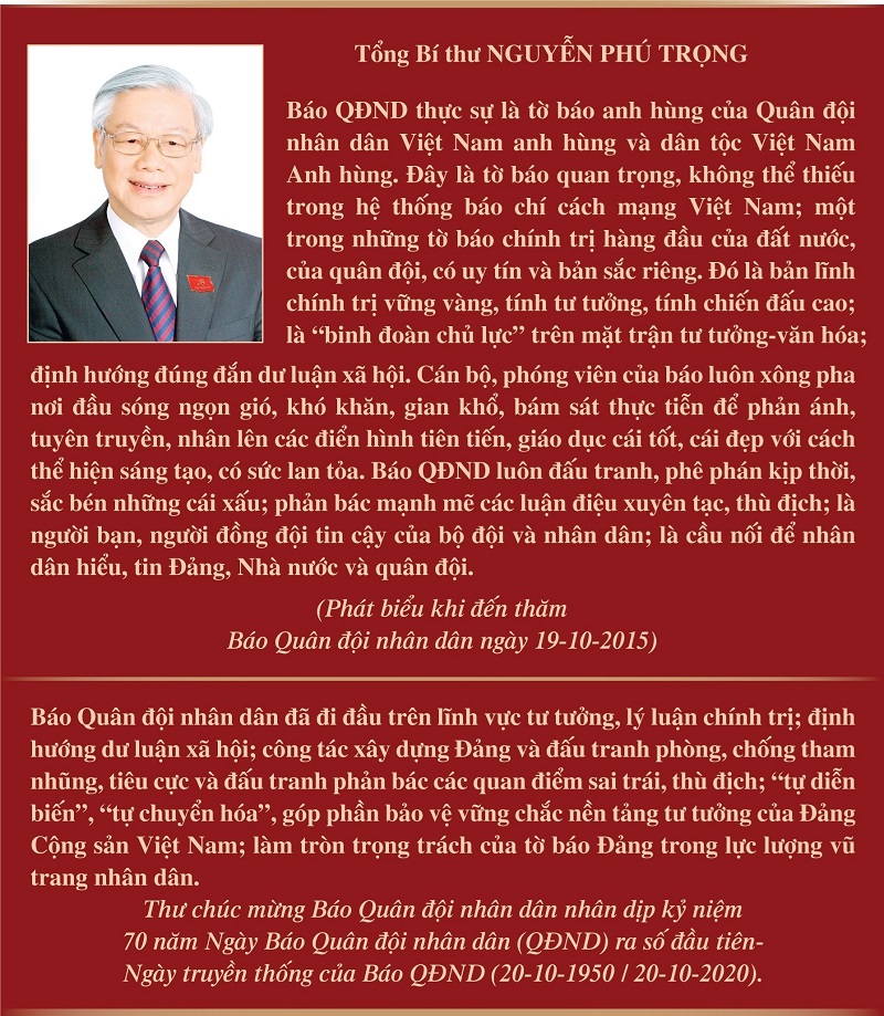 Chúng tôi nhớ mãi những lời căn dặn của đồng chí Tổng Bí thư khi chúc mừng cán bộ, phóng viên, biên tập viên, công nhân viên, chiến sĩ Báo Quân đội nhân dân về những kết quả đạt được trong thực hiện nhiệm vụ chính trị được giao. Trải qua 65 năm xây dựng, phát triển, Báo Quân đội nhân dân là tờ báo có vị trí rất quan trọng trong làng báo cách mạng Việt Nam, một trong những tờ báo chính trị hàng đầu của đất nước và Quân đội, có uy tín và bản sắc riêng, có bản lĩnh chính trị vững vàng, có tính tư tưởng, tính chiến đấu cao.