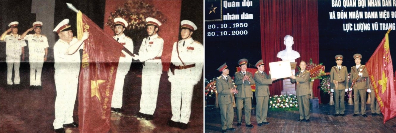 Thượng tướng Phạm Văn Trà, Bộ trưởng Bộ Quốc phòng trao danh hiệu Anh hùng LLVT nhân dân cho Báo Quân đội nhân dân (20-10-2000) - Ảnh bên phải. Thượng tướng Lê Văn Dũng, Chủ nhiệm Tổng cục Chính trị gắn Huân chương Sao Vàng lên Quân kỳ Quyết thắng Báo Quân đội nhân dân, tháng 6-2006 - Ảnh bên trái. Ảnh: Hoàng Như Thính và Xuân Gụ. |