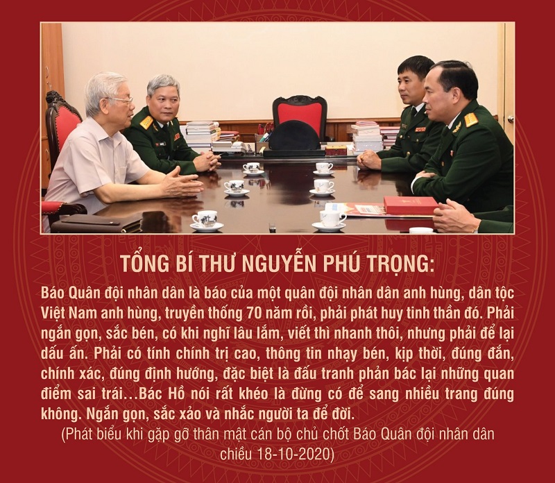Tổng Bí thư mong muốn Báo Quân đội nhân dân tiếp tục đấu tranh phê phán cái xấu, cái tiêu cực, bác bỏ những quan điểm sai trái, những nhận thức, cách nhìn lệch lạc; tiếp tục tuyên truyền, đưa hình ảnh Việt Nam, Quân đội nhân dân Việt Nam ra cộng đồng quốc tế, đồng thời thông tin về những vấn đề quan trọng của thế giới.
