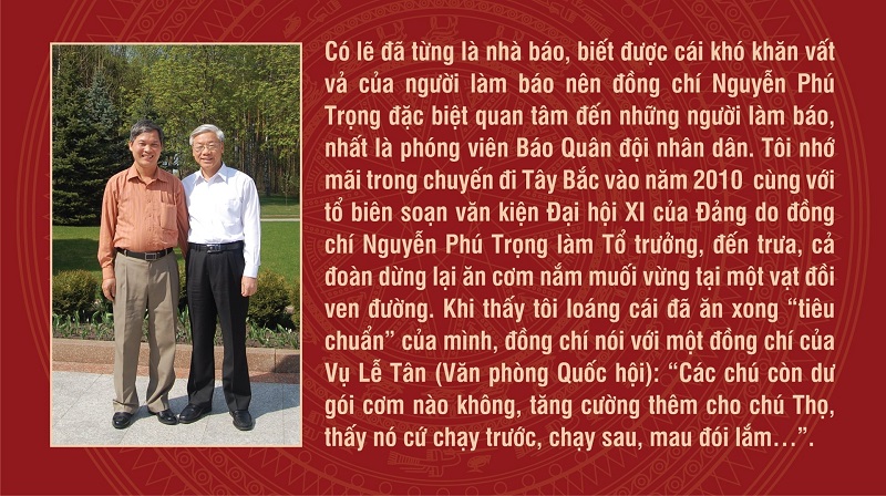 Tôi nhớ mãi kỷ niệm vào dịp Tết Kỷ Sửu (năm 2009) khi tháp tùng đồng chí Nguyễn Phú Trọng đến thăm và chúc Tết Bộ đội Biên phòng Lạng Sơn. Hôm sau đọc báo, đồng chí nói với tôi: “Bài viết của Thọ tốt đấy nhưng có một chi tiết tại sao Thọ lại không đưa vào bài, đó là kiến nghị của một đồng chí Bộ đội Biên phòng về chính sách hậu phương quân đội?”.