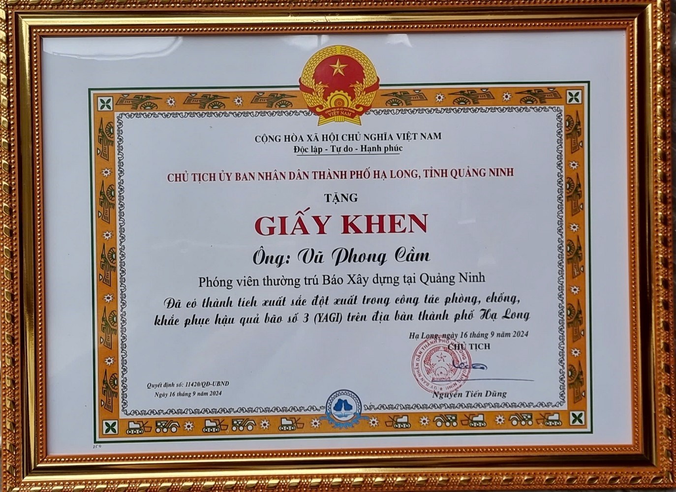 Những nhà báo vinh dự được UBND thành phố Hạ Long khen thưởng, có công trong chiến dịch cao điểm 7 ngày đêm khắc phục thiệt hại bão số 3 (Yagi) thắng lợi; trong đó có Nhà báo Vũ Phong Cầm, phóng viên Báo Xây dựng thường trú ở Quảng Ninh.