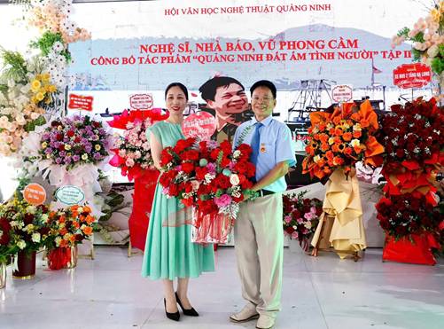 Phó Giám đốc Sở Văn hóa-Thể thao & Du lịch, Nguyễn Thị Thanh Thủy tặng hoa chúc mừng nhà báo Vũ Phong Cầm.