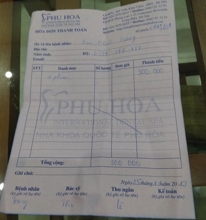 Cụ thể theo phản ánh của chị M.T ( trú tại Hà Nội) thì ngày 25/11/2019 chị đã đến phòng khám nha khoa Phú Hòa khám chữa bệnh và được nam nhân viên của phòng khám này tiến hành dịch vụ chụp X quang ngay tại cơ sở. Hóa đơn dịch vụ thể hiện cơ sở này chụp X quang khi chưa được Sở Y tế Hà Nội cấp phép và hình ảnh nhân sự thực hiện dịch vụ cũng thể hiện điều này.