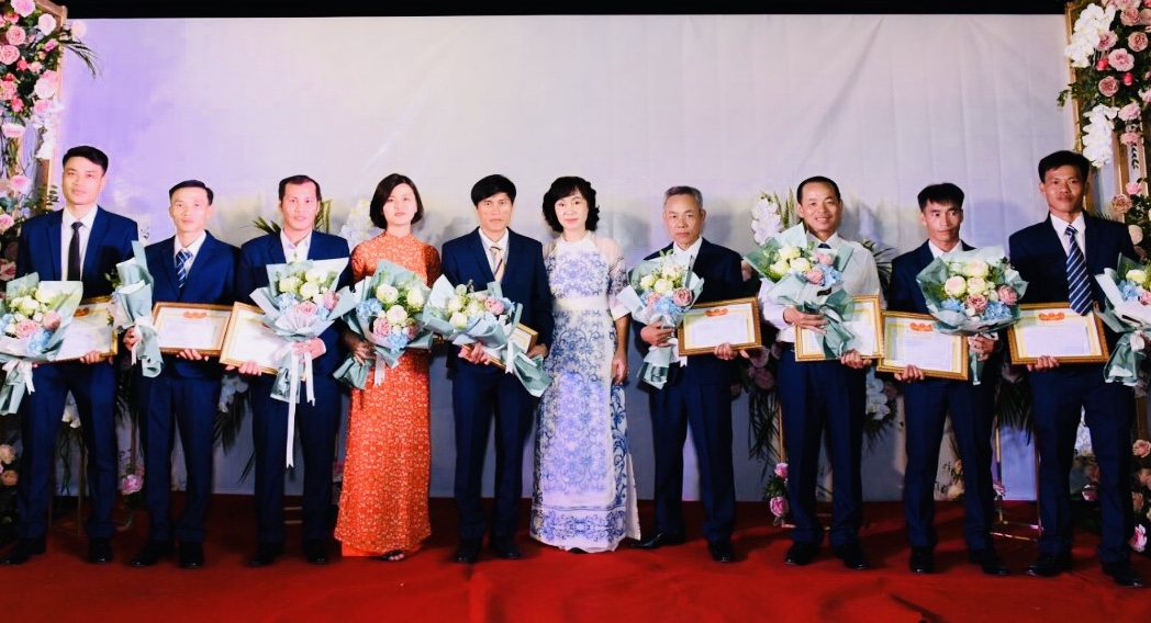 | Bà Nguyễn Thị Khánh Lợi tặng hoa và khen thưởng cho cán bộ, công nhân viên có quá trình làm việc trên 10 năm tại Nhà máy. |