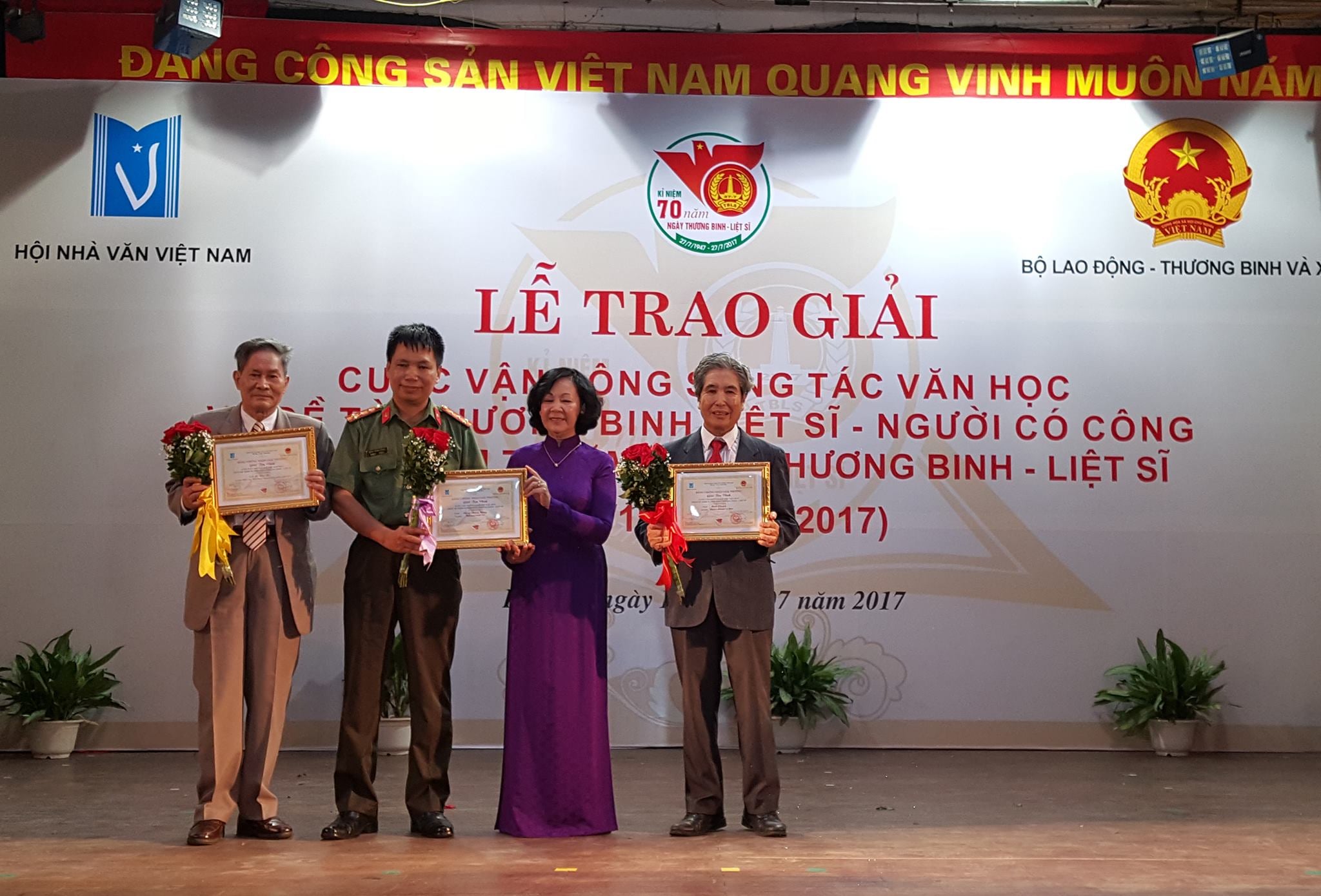 Ảnh: Trong dịp kỷ niệm 70 năm Ngày Thương Binh - Liệt sĩ, bà Trương Thị Mai, Ủy viên Bộ Chính trị, Trưởng Ban Dân vận Trung ương, đã trao Giải Tôn vinh đặc biệt cho Nhà văn Đặng Vương Hưng, vì đã có thành tích xuất sắc trong việc sưu tầm, biên soạn và giới thiệu tác phẩm "Mãi mãi tuổi 20" năm 2005.