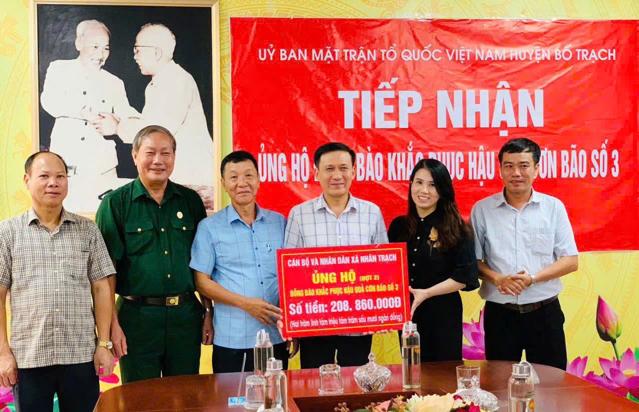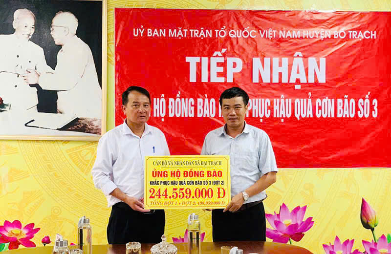 Uỷ ban Mặt trận Tổ quốc Việt Nam huyện Bố Trạch thông báo, sau khi hưởng ứng lời kêu gọi của Uỷ ban Mặt trận Tổ quốc Việt Nam tỉnh Quảng Bình, từ ngày 11-13/9 số tiền ủng hộ của mọi tầng lớp nhân dân trên địa bàn huyện là hơn 4,5 tỷ đồng. Ngay sau khi Ủy ban Mặt trận Tổ quốc huyện Bố Trạch, tỉnh Quảng Bình kêu gọi ủng hộ đồng bào các tỉnh phía Bắc bị thiệt hại do mưa lũ, nhiều người dân trong huyện đã nhắn tin, chuyển khoản tiền để ủng hộ đồng bào. Một số người dân, có cả những người cao tuổi, đã trực tiếp đến các nhà văn hóa thôn gửi tiền qua Ban công tác Mặt trận thôn để chuyển tới đồng bào. Chỉ sau mấy ngày phát động, 100% cơ quan, đơn vị đóng trên địa bàn huyện quyên góp, tính đến 16 giờ ngày 16/9, tổng số tiền mà các cơ quan, đơn vị, doanh nghiệp, nhà hảo tâm trên địa bàn huyện ủng hộ, đăng ký ủng hộ đồng bào các tỉnh phía Bắc khắc phục hậu quả thiên tai là hơn 8 tỷ đồng.