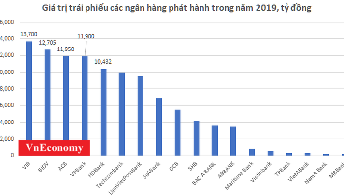 Thống kê cho thấy, 5 ngân hàng có giá trị phát hành trái phiếu lớn nhất trong năm 2019 gồm Ngân hàng Quốc tế Việt Nam (VIB), Ngân hàng BIDV, Ngân hàng ACB, Ngân hàng VPBank, và HDBank. Chỉ tính riêng 5 ngân hàng nói trên, giá trị trái phiếu phát hành thành công trong năm lên đến 60.687 tỷ đồng. Có 6 ngân hàng phát hành trái phiếu với giá trị trên 10.000 tỷ đồng/ngân hàng.