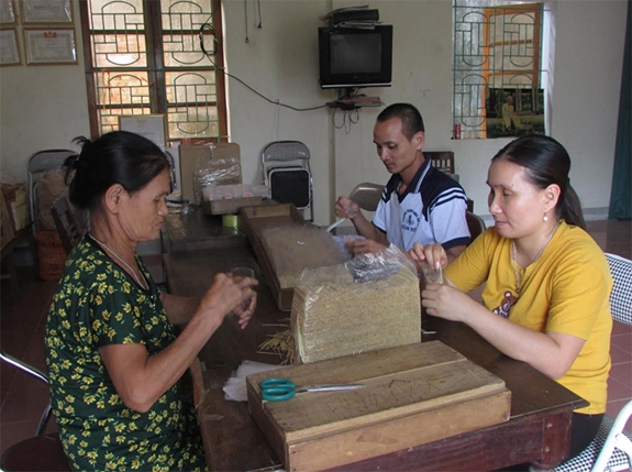 | Chị Thương Hoài (bên phải) tham gia sản xuất tăm tre. |