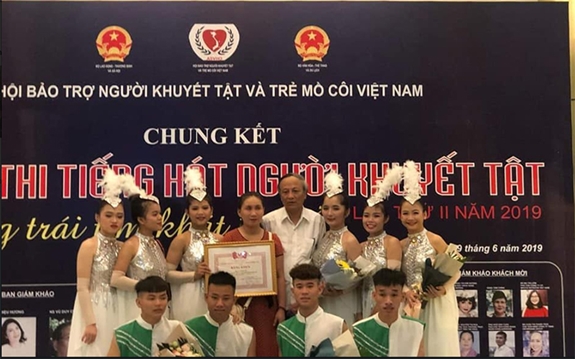 | Chị Thương Hoài (thứ tư từ trái sang) nhận bằng khen tại Hội thi toàn quốc tiếng hát người khuyết tật, lần thứ 2. |