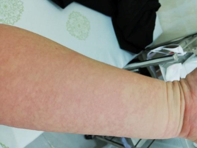 Toàn thân chị Hương xuất hiện mề đay kèm theo triệu chứng khó thở và ngất đi khi đến viện. Ảnh: Nhân vật cung cấp.