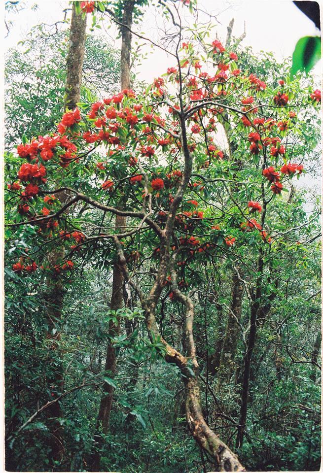 Cả nhóm ăn trưa vội vàng và lại lên đường, ngày 1 và ngày 2 chúng tôi chỉ ăn và leo núi từ sáng sớm đến tối mịt đôi chân phải làm việc 10h-12h/ ngày chúng cũng tỏ ra khó bảo, không còn bước chuẩn như buổi đầu, có đoạn đi bộ qua thân cây gỗ bắc qua suối cạn, xảy chân là rơi xuống độ cao 15m dưới toàn đá hộc chúng tôi đều đứng nghỉ lấy lại bình tĩnh trước khi bước lên cầu và may thay cả đoàn không ai việc gì. Đi được nửa quãng đường xuống núi cơn khát lại hành hạ chúng tôi, sẵn vỏ chai nhựa anh em múc nước suối uống tạm, không có lựa chọn gì khác trên đường xuống rất nhiều cây hoa Đỗ Quyên đỏ thắm rất đẹp, thỉnh thoảng cậu bạn trong đoàn lại nhìn đồng hồ đo độ cao còn 2200m cứ giảm dần, anh em hỏi liên tục.