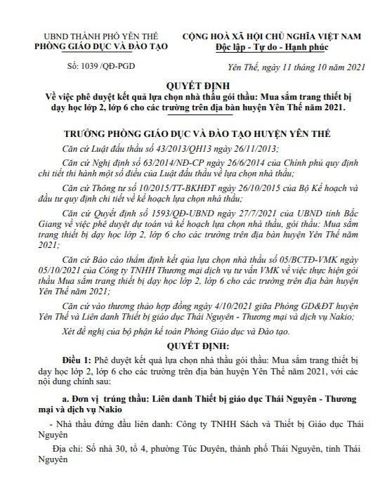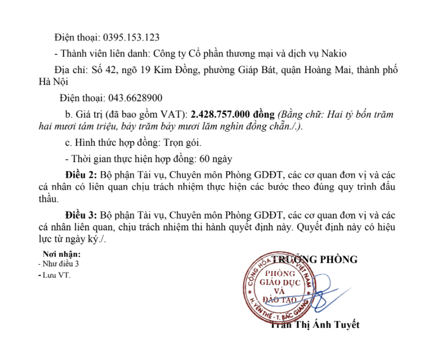 Quyết định phê duyệt trúng thầu do bà Trần Thị Ánh Tuyết, trưởng Phòng GD&ĐT huyện Yên Thế ký.