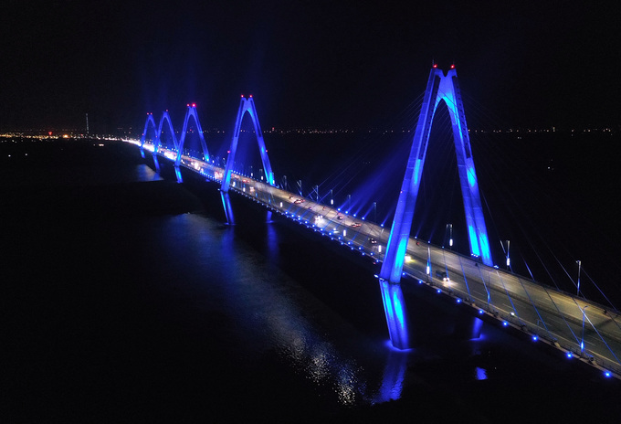 Hệ thống chiếu sáng Cầu Nhật Tân (Hà Nội) cũng bật đèn xanh toàn bộ.