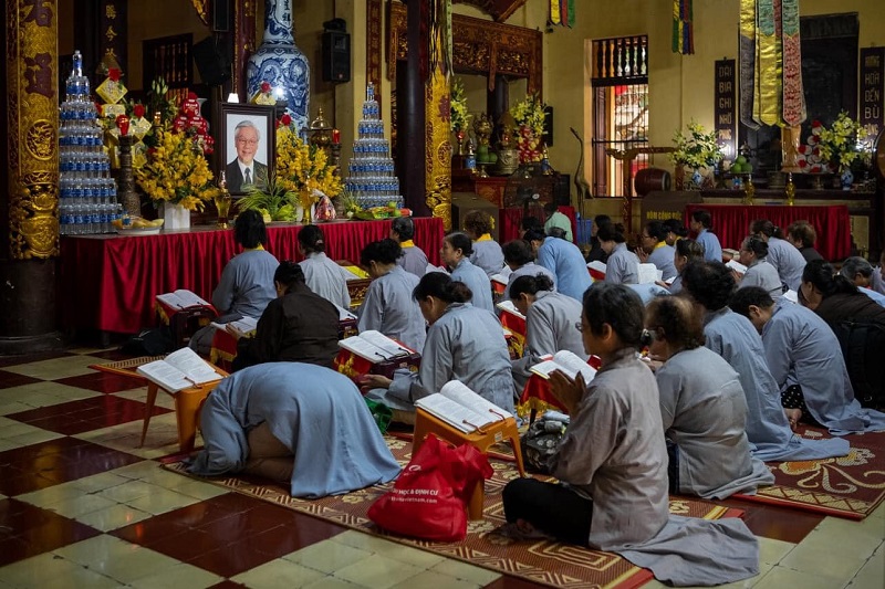 Các Phật tử tụng kinh tưởng niệm trước ban thờ di ảnh Tổng Bí thư Nguyễn Phú Trọng tại chùa Quán Sứ - Trụ sở Giáo hội Phật giáo Việt Nam. Nguồn: Chùa Quán Sứ.