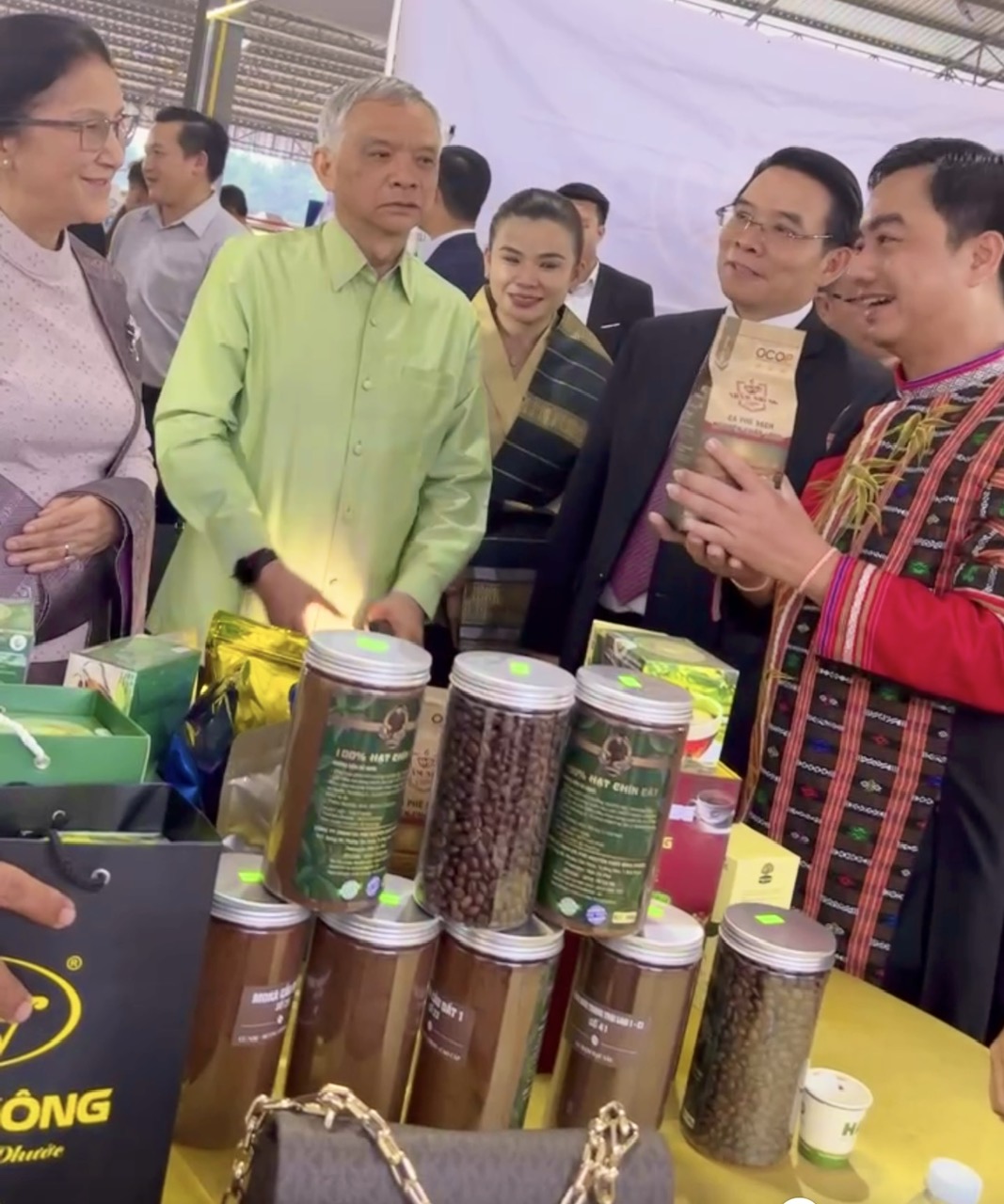 Phó Chủ tịch nước Lào Pany Yathotou (bìa trái) và Phó Chủ tịch Quốc hội Lào Sommad Pholsena (áo xanh lá cây) và Ủy viên Trung ương Đảng NDCM Lào, Bí thư, Tỉnh trưởng tỉnh Champasak Vilayvong Bouddakham hào hứng nghe PCT TT Hội Hữu nghị Việt Nam - Lào tỉnh Bình Phước Trần Quốc Duy giới thiệu các nông sản tiêu biểu của tỉnh tại Lễ hội Cà phê, trà và nông sản khu vực cao nguyên Bolaven năm 2023.
