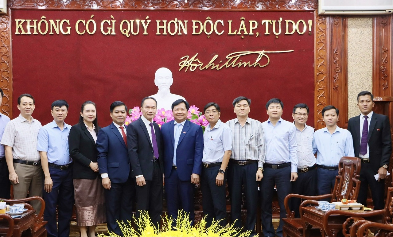 Tổng lãnh sự Lào tại TP.HCM Phonesy Bounmixay (thứ 5, trái sang) chụp hình lưu niệm cùng lãnh đạo tỉnh và Hội Hữu nghị Việt Nam - Lào tỉnh Bình Phước trong buổi chào xã giao và chúc Tết lãnh đạo tỉnh này.