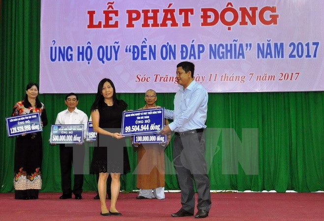 | Các đơn vị, tổ chức trao biểu trưng đóng góp vào Quỹ “Đền ơn đáp nghĩa” cho Chủ tịch Ủy ban MTTQ Việt Nam tỉnh Sóc Trăng. (Ảnh: Trung Hiếu/TTXVN) |