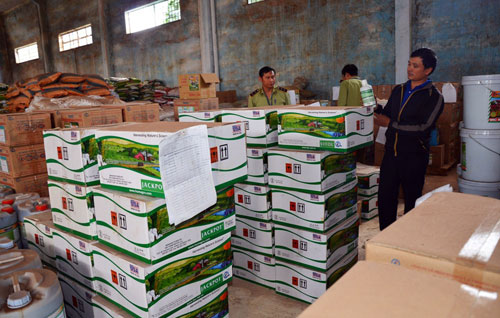 | Cơ quan chức năng đang kiểm tra số lượng phân bón giả trong kho của Thuận Phong |