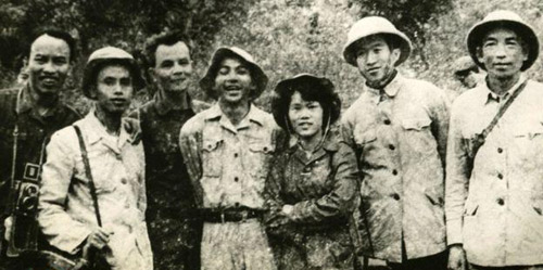 | Nhà báo Dương Thị Xuân Quý cùng đồng đội của mình trên chiến trường. |