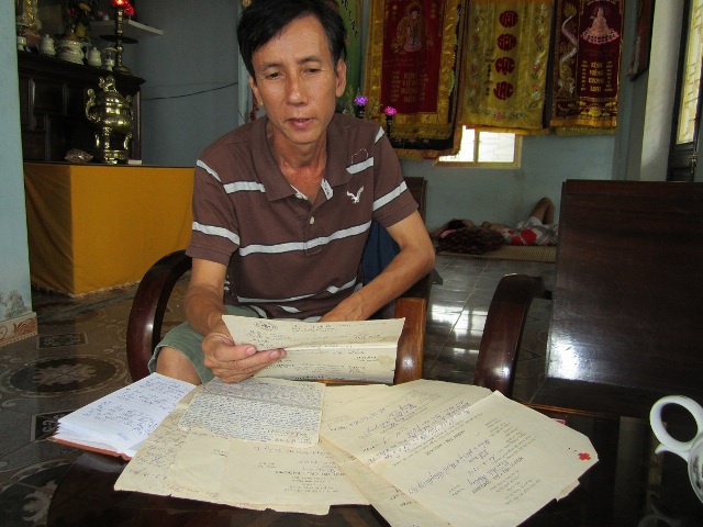 | Cựu binh Gạc Ma Trần Thiên Phụng bên những kỷ vật như thư từ, giấy báo tử của chính mình. (Ảnh: Ngọc Vũ) |