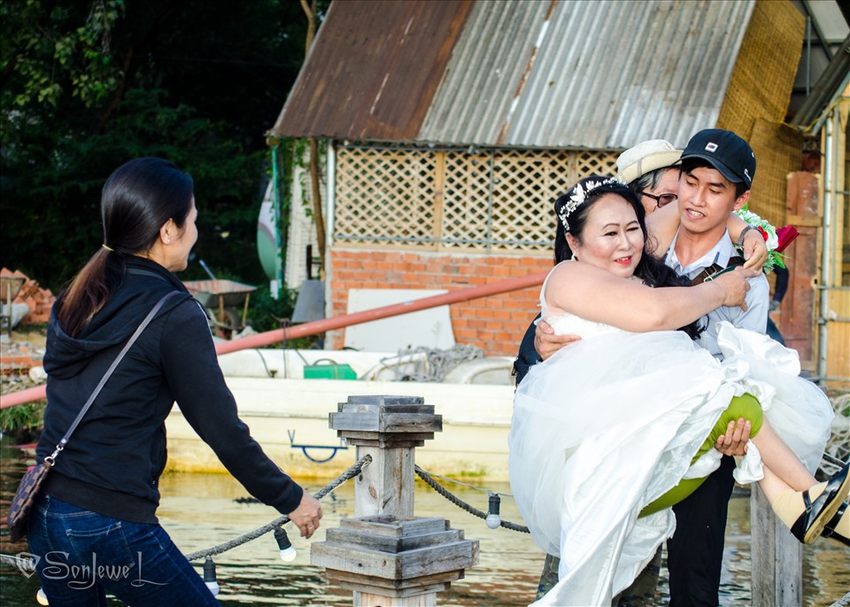 Ngày anh chị chụp ảnh cưới, trời Sài Gòn nắng như đổ lửa. Nhìn hình ảnh anh Huynh và những người đồng nghiệp bế chồng rồi bế mình di chuyển hết chỗ này đến chỗ khác, chị Nhánh không khỏi xúc động.