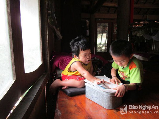 Cũng trên chiếc giường của mình, Giang bày cho các cháu mình những bài học tập đọc, tập làm toán đơn giản. Ảnh Nga Nga