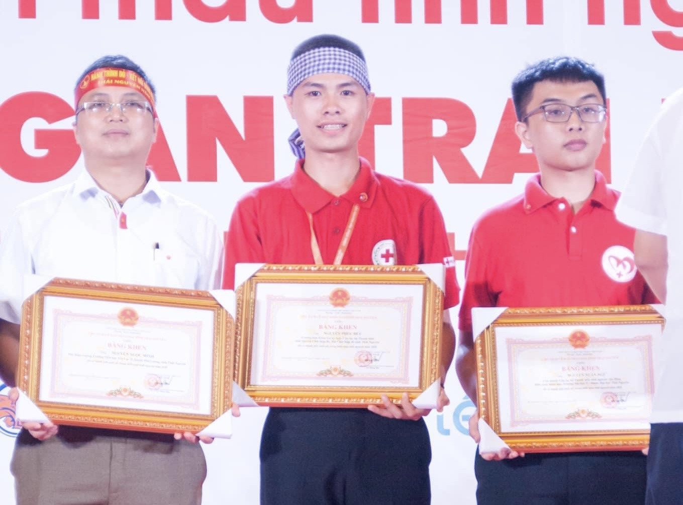 Nguyễn Phúc Đức (ở giữa) trong lần nhận bằng khen của Chủ tịch UBND tỉnh Thái Nguyên về những đóng góp trong hoạt động hiến máu tình nguyện.(Ảnh: Kiên Nguyễn/LĐ)