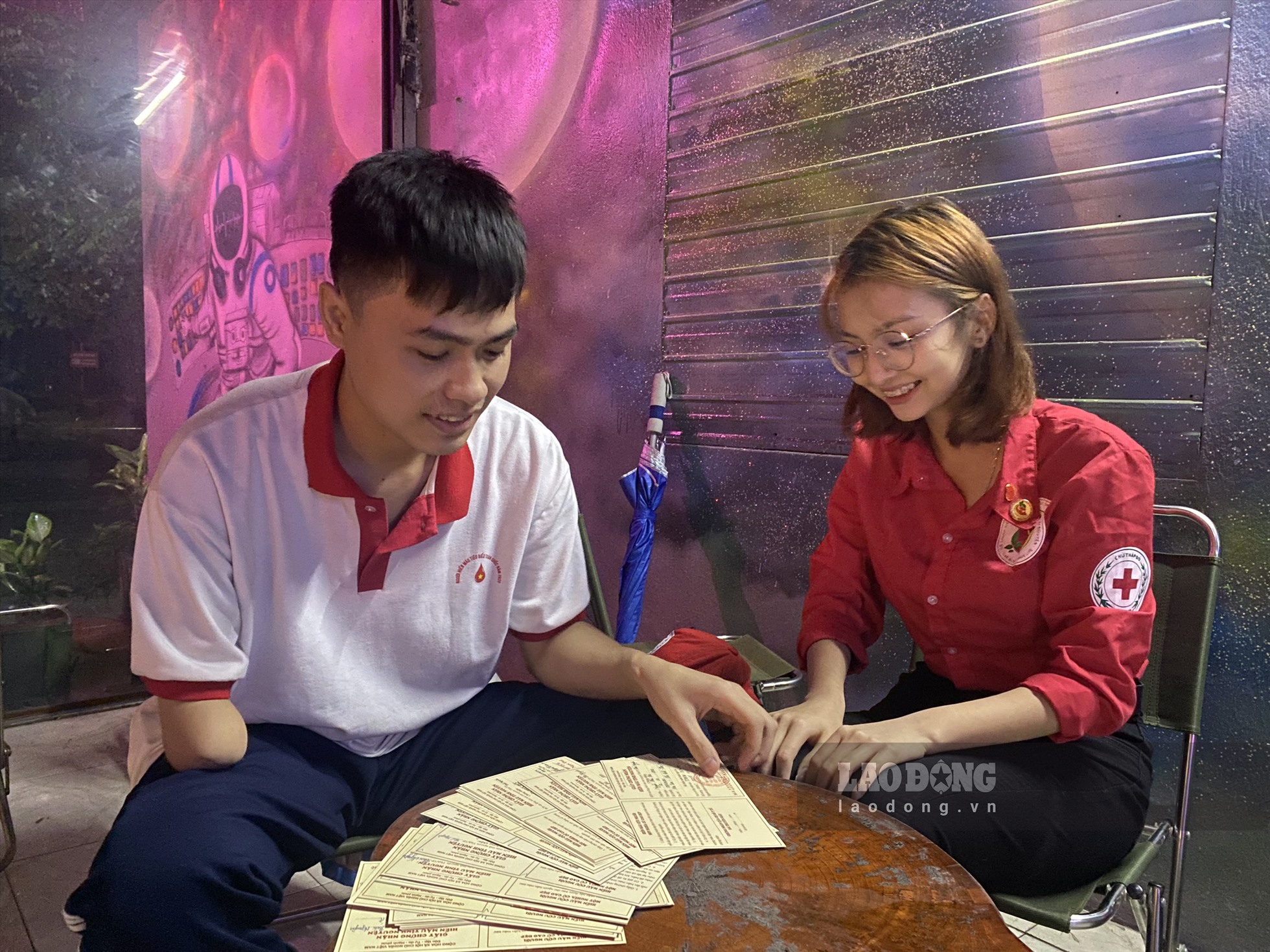 Nguyễn Phúc Đức cùng bạn tình nguyện viên nhìn lại quá trình 24 lần hiến máu của mình qua giấy chứng nhận. (Ảnh: Lao động)