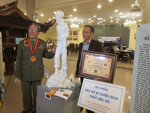 | Đại tá, Họa sĩ Lê Duy Ứng TB nặng hạng ¼ (91%) bên tác phẩm “Bác Hồ đi chiến dịch. Chất liệu: đá, do chính ông sáng tác” |