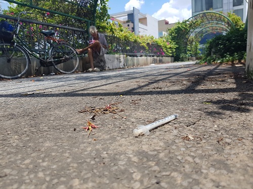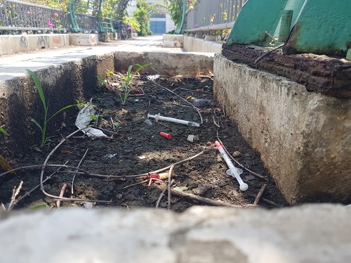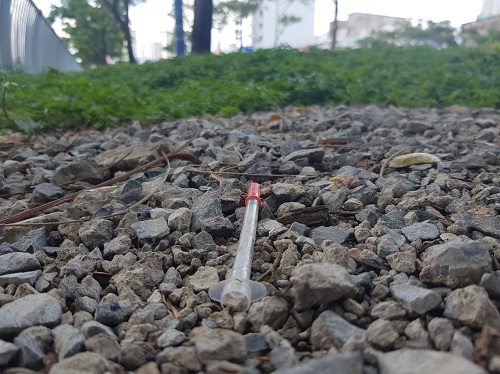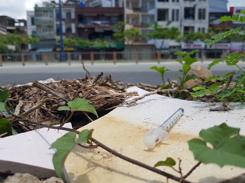 Tại đây, khoảng 11h đến 12h dọc tuyến đường bắt đầu thấy những con nghiện xuất hiện. Sau những cơn phê vật vã, những cái xác không hồn này ngang nhiên bỏ lại vương vãi những ống kim tiêm đã qua sử dụng, gây ra nỗi ám ảnh kinh hoàng cho người dân thường xuyên qua lại trên con đường này.