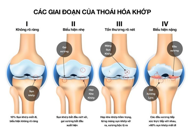 Thoái hóa khớp gối có 4 giai đoạn, mỗi giai đoạn đặc trưng bằng các triệu chứng và dấu hiệu khác nhau như:
