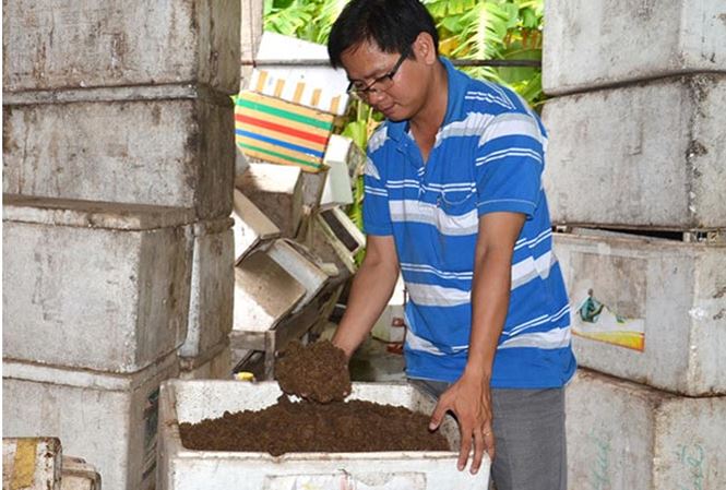 | Anh Trần Phúc Hậu với chế phẩm vi sinh từ bột bã mía. Ảnh: N.D |