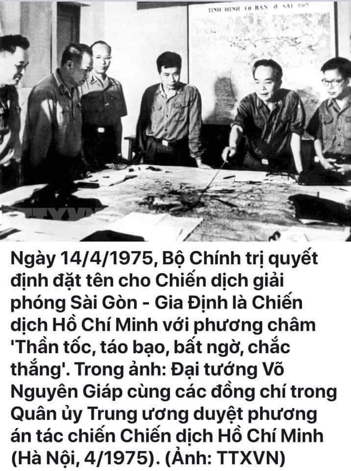 Ngày 14/4/1975: Bộ Chính trị chấp thuận đề nghị của Tư lệnh chiến dịch đổi tên chiến dịch Sài Gòn – Gia Định là chiến dịch Hồ Chí Minh.