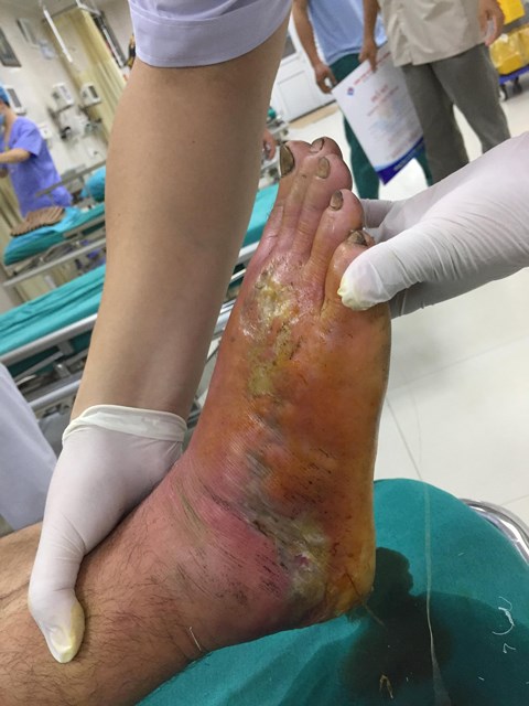 Bệnh nhân T.Q.H (53 tuổi, trú tại Na Hang, Tuyên Quang) nhập viện trong tình trạng tổn thương mu chân phải lan rộng, sưng nề đỏ, có dịch mủ màu vàng, hôi, hoại tử; sưng nề lan lên hết cẳng chân phải.