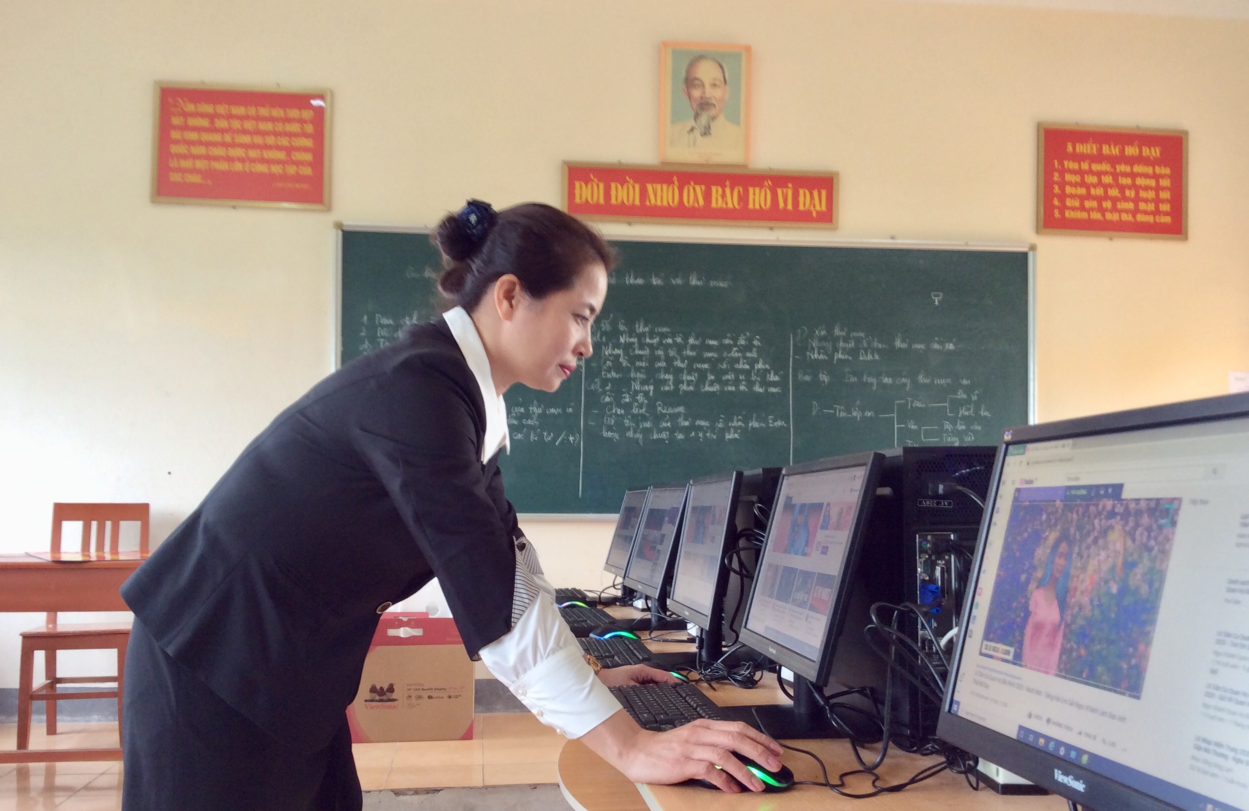 Bà Nguyễn Thị Thư - Giám đốc Doanh nghiêp đấu giá tư nhân An Mạnh kiểm tra lại máy trước lúc trao cho nhà trường
