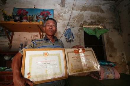 Ông Hào trong căn nhà rách nát cùng giấy tờ 30 năm tuổi Đảng của bố và bằng công nhận liệt sĩ của mình.