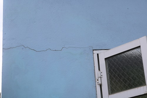 Ông Hà Văn Nhì, nạn nhân chất độc da cam chỉ vào ngôi nhà bị rạn nứt nhiều chỗ.