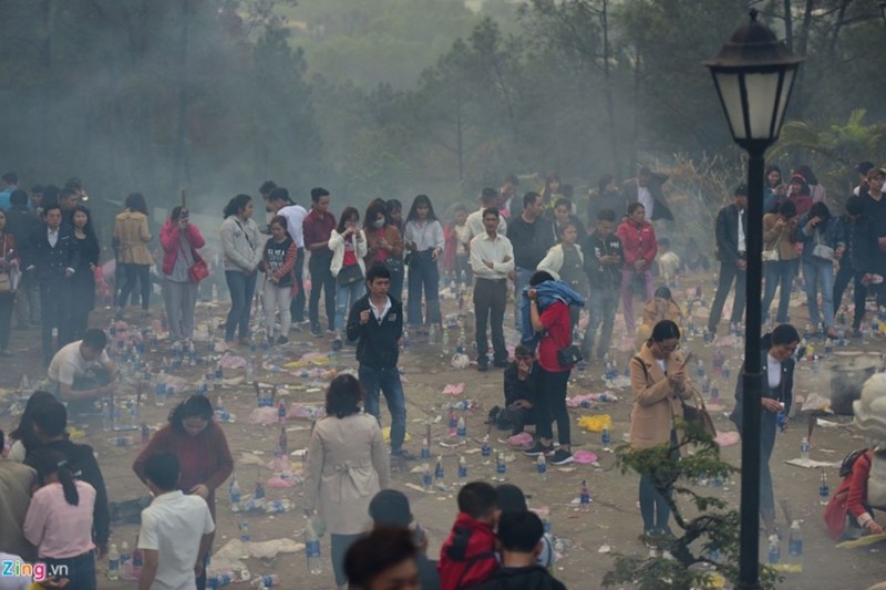 | Khách đến lễ ở tượng đài Quán thế âm (Thừa Thiên-Huế) vào dịp xuân Mậu Tuất. Du khách mang theo chai nước và hương. Sau khi lễ xong, các chai nước vương vãi khắp nơi. Ảnh: Zing |
