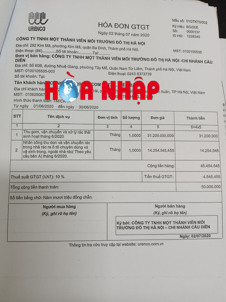 Hóa đơn của URENCO 7 xuất cho đối tác khi thực hiện dịch vụ sai quy định của thành phố Hà Nội.