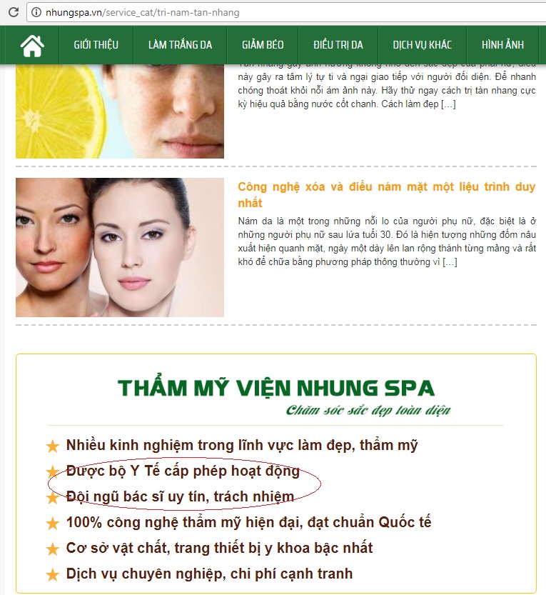 Vào trang website chính của Nhungspa.vn, người tiêu dùng hoàn toàn có thể bị choáng ngợp bởi những dòng quảng cáo “Thẩm mỹ viện Nhungspa là một trong những đơn vị cung cấp các dịch vụ chăm sóc sắc đẹp có chất lượng uy tín hàng đầu tại Hà Nội. Với hơn 10 năm hoạt động Nhungspa đã dần chiếm được lòng tin và sự đánh giá cao từ phía khách hàng nhờ có đội ngũ nhân viên chuyên nghiệp, nhiệt tình cùng phương pháp điều trị, chăm sóc sắc đẹp với những công nghệ hiện đại bậc nhất trên thế giới mang lại hiệu quả cao, nhanh chóng nhưng không hề ảnh hưởng đến sức khỏe. Với Nhungspa, lợi ích của khách hàng luôn được đặt song hành cùng lợi ích của mình”. Thậm chí Nhung spa còn quảng cáo là các dịch vụ đã được cấp phép của Bộ Y tế.