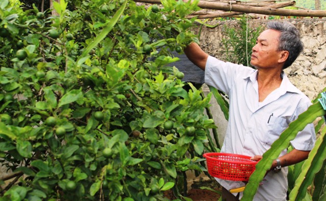 | Bệnh binh Nguyễn Đình Hải thu hoạch chanh trong trang trại của gia đình. |