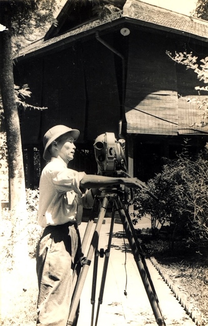 Nhà quay phim Trần Anh Trà đang quay cảnh nhà sàn Bác Hồ 9/1969 (ảnh NVCC)