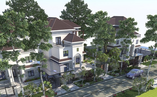 Mỗi căn biệt thự cũng được thiết kế khoảng lùi hợp lý để trồng cây bao quanh, cho gia chủ vui vầy cuộc sống điền viên giữa thảm thực vật đa tầng tán và không gian xanh mướt đẹp như tranh vẽ.